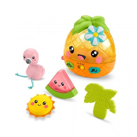 費雪可愛聲光小鳳梨含有4個配件-西瓜、太陽、紅鶴和椰子樹。將配件放進鳳梨時,會有燈光、聲音和音樂鼓勵寶寶,讓寶寶訓練小手肌肉同時學習認知。